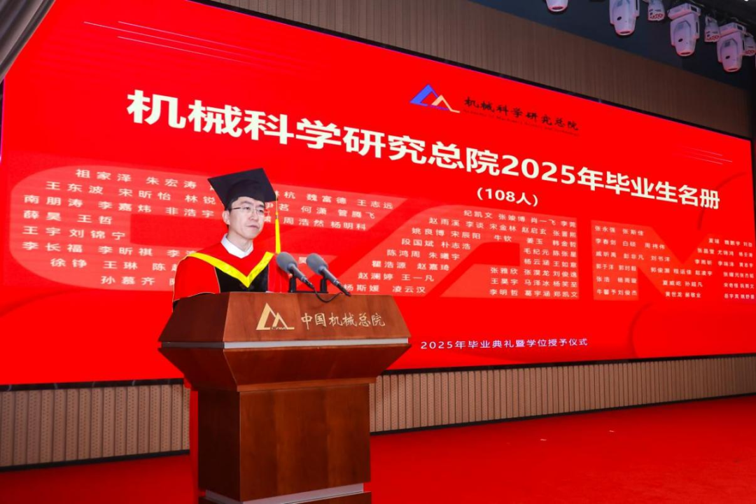 李愛國宣讀了《機械科學研究總院2025屆畢業(yè)生學位授予決定》,王德成為每位畢業(yè)生撥穗正冠并頒發(fā)學位證書。